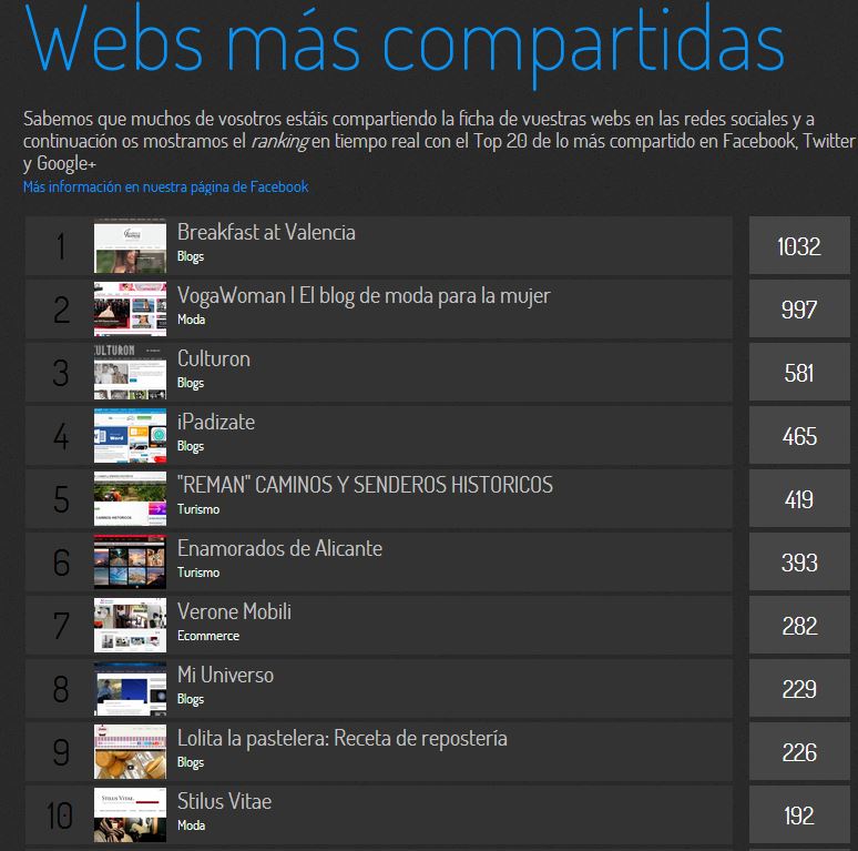 El Blog «Mi Universo» se ha situado en el 8º lugar de las webs más compartidas de las más de 400 presentadas a los premios web de las Provincias, muchas gracias a tod@s los que votasteis o la compartisteis, hoy dan los premios en la Gala de Premios web de las Provincias en la Ciudad de las Artes y las Ciencias de Valencia. No tenemos premio pero muchas gracias por la ayuda 🙂