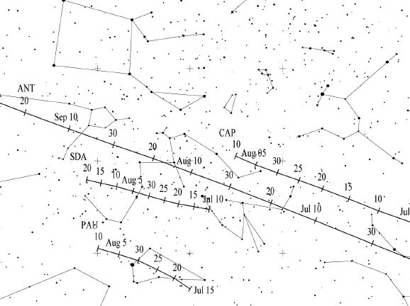 Imagen: Recorrido a lo largo de los días de los puntos radiantes de las diferentes lluvias de meteoros de julio y agosto en la dirección SE.