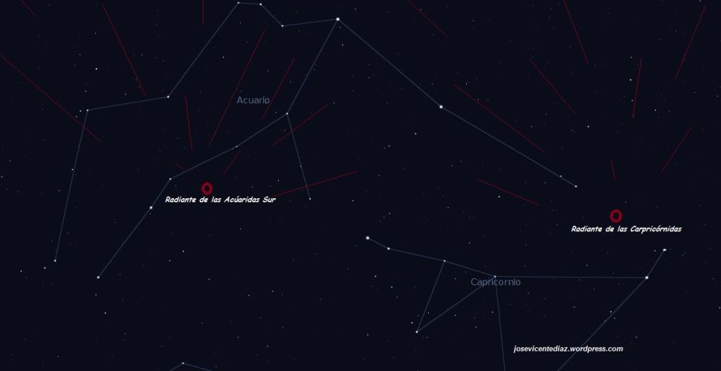 Los radiantes de los meteoros (punto desde donde parecen partir) están en dirección SE, y con sus radiantes ascendiendo. Por tanto empezaremos a observar meteoros de trazos largos ascendiendo por el cielo, los más espectaculares son las capricórnidas por su tremendo brillo, pero suelen aparecer pocos aunque espectaculares. La lluvia de las acuáridas sur es muy activa, y podremos ver muchos meteoros, sobretodo a altas horas de la madrugada, a partir de las 3 es buena hora para observar muchas estrellas fugaces.