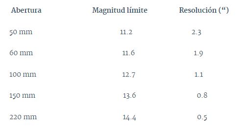 Otro factor que puede afectar a la magnitud limite que podemos ver es nuestra propia capacidad visual, nuestro ojo tarda alrededor de 20 minutos en adaptarse a la oscuridad, a partir de esos minutos podremos apreciar más estrellas a simple vista y a través del telescopio. Con el telescopio observaremos objetos más débiles al aumentar la abertura y obtendremos mayor resolución, como podemos apreciar en la siguiente tabla teórica. Estos resultados son para objetos puntuales, ya que los objetos más extensos como galaxias y nebulosas tienen repartida en su superficie la magnitud aparente: