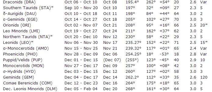 En esta estación hay tres lluvias de estrellas fugaces muy importantes, la Dracónidas de Octubre (máximo 8 de octubre), las Oriónidas de Octubre (máximo el 21 de octubre)  y las Leónidas de Noviembre (máximo el 17 de noviembre), estas últimas con actividad variable y muchas veces muy alta.