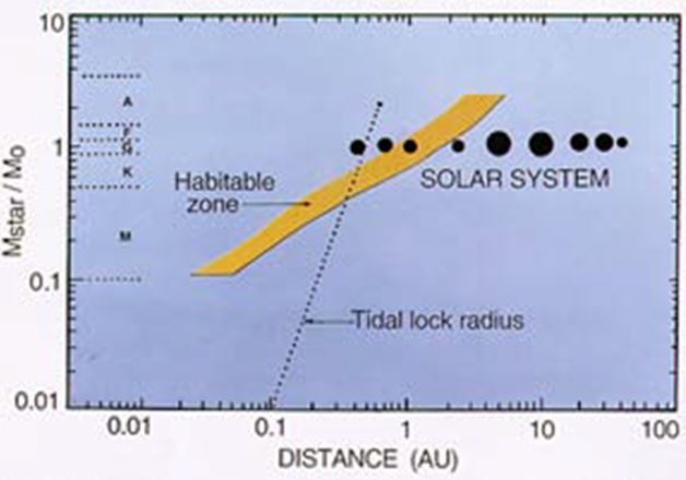 La zona de habitabilidad es la zona del sistema planetario en la que el agua se puede mantener en estado líquido. Esta zona depende de la masa de la estrella. Conforme aumenta la masa de la estrella la zona de habitabilidad es cada vez más lejana.