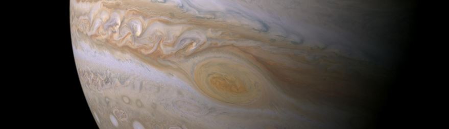 Júpiter es el quinto planeta del Sistema Solar, es una gigantesca esfera de gas, formado principalmente por hidrógeno y helio, que sí tuviera un tamaño un poco mayor podría haberse encendido como estrella y tendríamos un sistema binario en nuestro sistema solar. Se le denomina planeta exterior gaseoso y fue de los primeros planetas en formarse, por su enorme tamaño influyó mucho en la zona del cinturón principal de asteroides impidiendo que se formara allí un planeta. Entre sus detalles atmosféricos más importantes destacan la Gran mancha roja, que no es más un espectacular anticiclón, tiene además una enorme estructura de nubes en bandas oscuras y brillantes. Su enorme dinámica atmosférica global viene determinada por intensos vientos con velocidades de hasta 500 km/h.