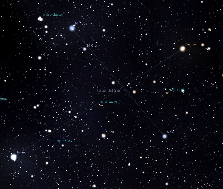 La Cruz del Sur, imagen desde Stellarium (pulsar sobre ella para apreciar los detalles).