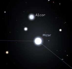 Mizar se encuentra a 60 años luz de la Tierra y Alcor a 80 años luz con lo que no son estrellas binarias, están muy alejadas, pero nuestra posición en la galaxia nos hace verlas cercanas entre sí pero no tienen relación alguna. Mizar a su vez es una estrella doble, junto a ella órbita otra estrella, lo que la convierte en binaria, pero hay que utlilzar grandes telescopios para poder ver a su compañera.