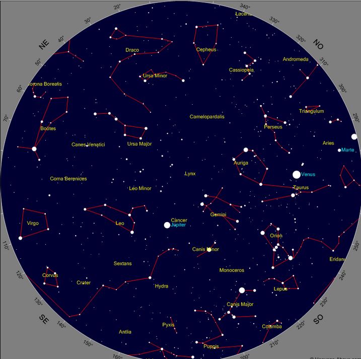 Las constelaciones de invierno cada vez las veremos menos, la constelación de Orión, Tauro y Géminis se van acercando al Oeste conforme vaya pasando el mes. También es una época desfavorable para observar la Vía Láctea, ya que sale por el sur y se extiende por las constelaciones invernales que van poniéndose hacia el Oeste.