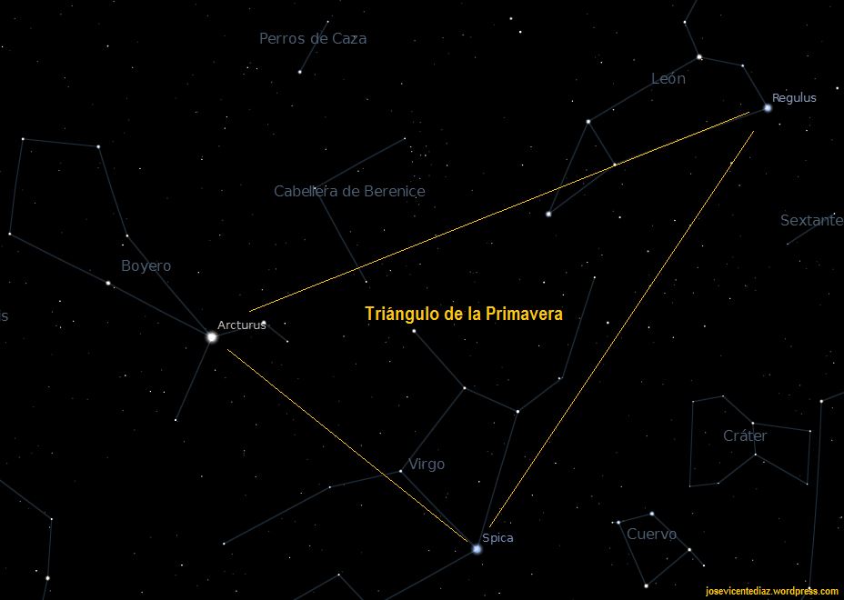Las constelaciones primaverales más importantes las tenemos todas en una franja del sur a oeste. La estrella más importante de Leo, Régulus, está alcanzando nuestro meridiano (linea imaginaria en el cielo que une el norte con el sur y pasa justo sobre nosotros). Al lado de Leo tenemos la débil constelación de Cáncer, en la que se encuentra transitando el planeta Júpiter, y un objeto precioso, el cúmulo del Pesebre (M44). Más al SE tenemos a Virgo, una constelación bastante débil pero con una estrella importante, spica (la espiga). Al Este ascendiendo tenemos a la constelación de Boyero, con su estrella más importante y espectacular, Arturo. Las estrellas Spica, Régulus y Arturo forman el llamado triángulo de la primavera. Cuando vemos aparecer estas tres estrellas al anochecer es un indicativo de que estamos entrando en la primavera.