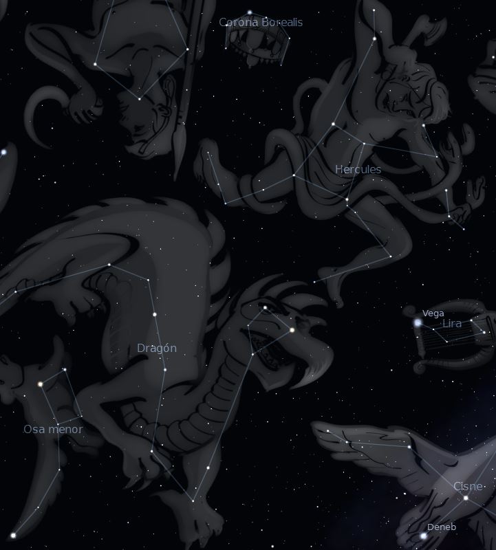 En el firmamento hay una constelación espectacular y con mucha historia: Draco (El Dragón). Los dragones aparecen en muchas leyendas antiguas, y por tanto no es sorprendente encontrar uno representado entre las estrellas. Podemos encontrar la constelación enrollada alrededor del polo norte celeste: