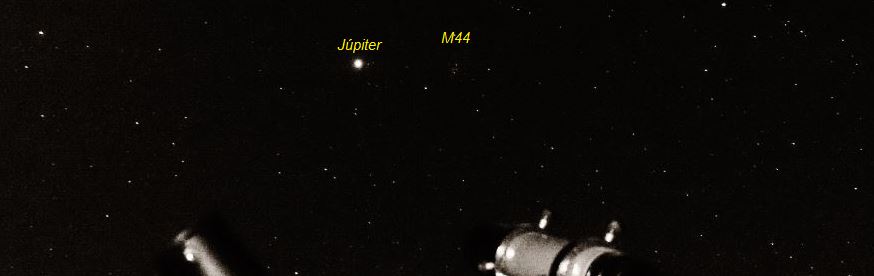Estas noches se prestan mucho a la observación del planeta Júpiter, con un telescopio es realmente espectacular. También son buenas noches para tomar imágenes del cielo. Os dejo esta imagen en la que se puede ver el planeta Júpiter (punto más brillante) y junto a él el cúmulo del pesebre (M44).