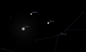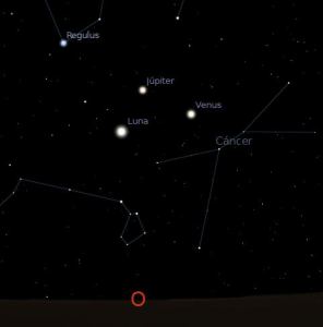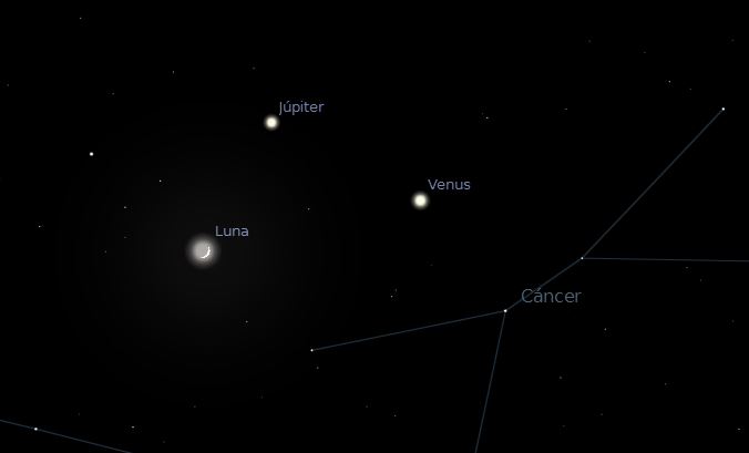 El próximo 20 de junio ocurrirá una bonita conjunción entre la Luna y los planetas Júpiter y Saturno, a partir del anochecer los podremos ver muy cercanos aparentemente entre sí en la bóveda celeste. Además estarán muy cerca del cúmulo del pesebre (M44) en la constelación de Cáncer, con lo que se presta a muy buenas fotografías para los astrofotógrafos.