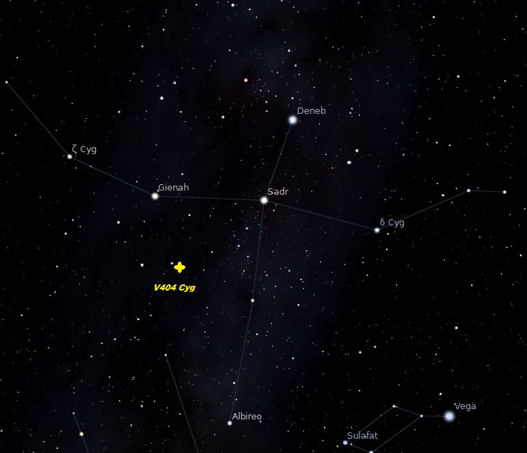 V404 Cygni, es un sistema binario ubicado a unos 8.000 años luz de distancia de nosotros y que contiene un agujero negro. El agujero negro ha «disparado» un tremendo estallido de luz de alta energía, convirtiéndose en una nova de rayos x. Hasta esta detección, había estado dormido desde 1989.En este sistema, una corriente de gas de una estrella fluye hacia el agujero negro que tiene una masa de 10 masas solares. Todo ese gas se acumula en un disco de acreción alrededor del agujero negro y debido a esto el aguejero negro emite alta energía que podemos detectar desde la Tierra.