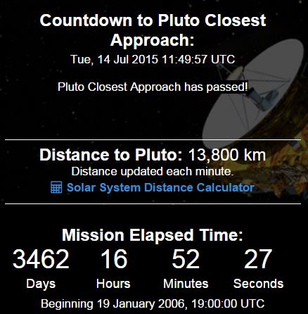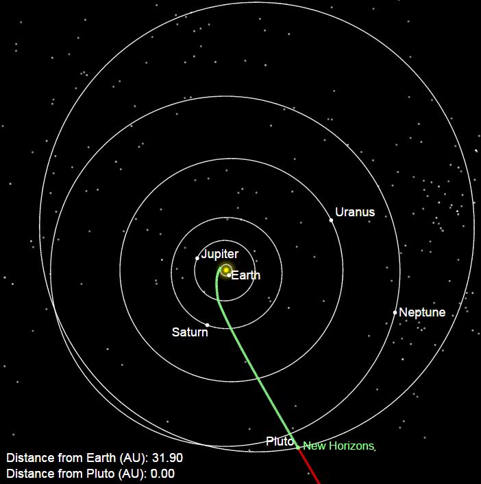 Un viaje interplanetario de 9 años y medio en el que ha recorrido 32 unidades astronómicas, lo que equivale la friolera de casi cinco mil millones de kilómetros. Nuevas y espectaculares imágenes nos esperan del planeta enano Plutón y de su sistema planetario (su acompañante Caronte y sus 5 satélites). Se ha visto que tiene una interesante geología y además se ha determinado que es aun más grande de lo que se pensaba, tiene 2370 km de diámetro.