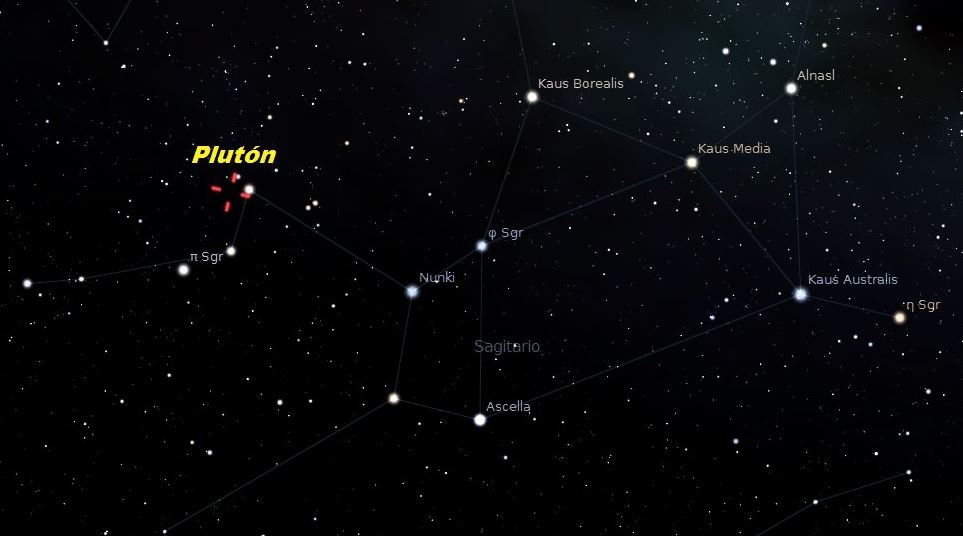 Desde la Tierra ¿en que constelación podemos observarlo? Plutón tiene un brillo muy débil ya que está muy alejado, pero con grandes telescopios podemos verlo como un objeto muy débil de magnitud 14 en dirección a la constelación de Sagitario.