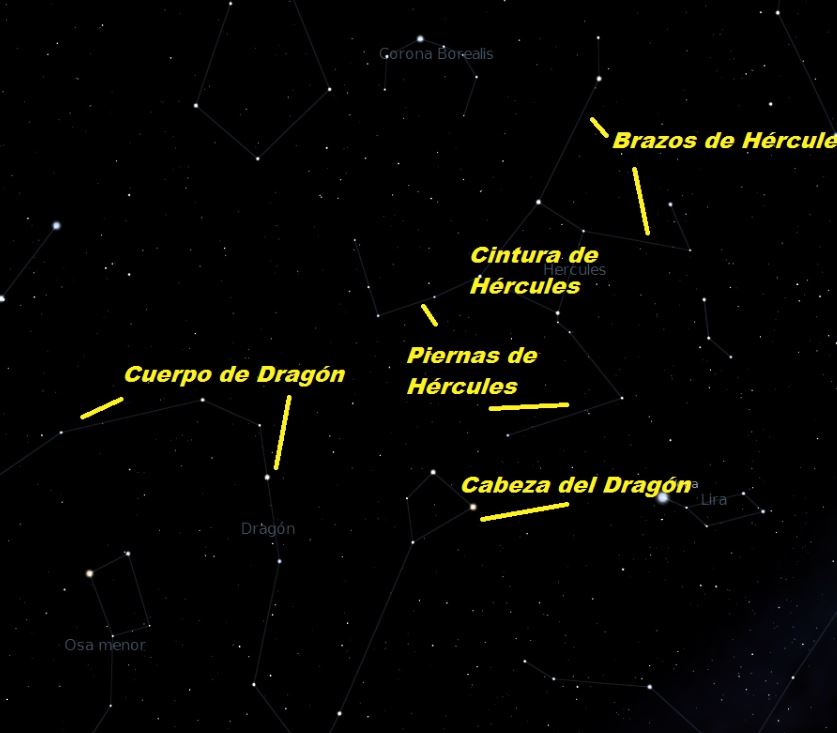 Los personajes o cosas convertidos en constelaciones, tienen una descripción icónica según la cual los principales atributos del personaje aparecen reproducidos o directamente evocados en la disposición, el número y hasta el brillo de las estrellas. Es complicado aveces observar en el cielo estrellado estas constelaciones, probablemente sí un astrónomo os dice que hay un león en el cielo o que se ve a un héroe mitológico peleando con un dragón pensareis que es imposible de ver… pero aunque sea difícil de observar para personas que aun no reconocen bien las constelaciones, esas cosas y muchas más se pueden observar en el cielo y cuando las descubráis os sorprenderán totalmente. Os voy a poner algún ejemplo (primera imagen solo las estrellas, la segunda imagen y tercera con la forma de la constelación-pulsar sobre las imágenes para ver los detalles)