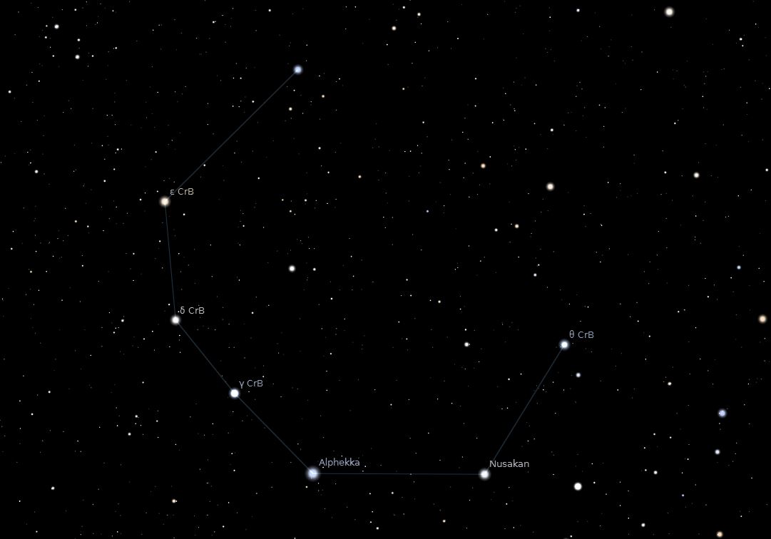 Esta bonita constelación consiste en una media corona formada por siete estrellas, siendo la más brillante la estrella Gemma (también llamada Alphekka), que se sitúa en la corona como su gema central, como bien indica su nombre. Se trata de una estrella blanco-azulada distante a 78 años luz de nosotros. Es una binaria eclipsada como la estrella de Perseo, Algol, aunque varía muy poco de brillo y es casi inapreciable a simple vista, este cambio ocurre cada 17 días y le baja la magnitud aparente (2.2) solamente 0.1 unidades.