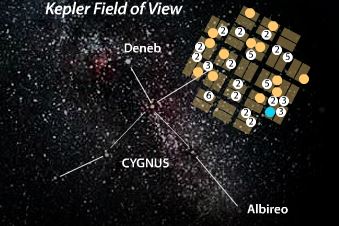 Candidatos a exoplanetas en la constelación del Cisne, uno de esos puntos es el planeta Kepler-452b. Imagen de NASA