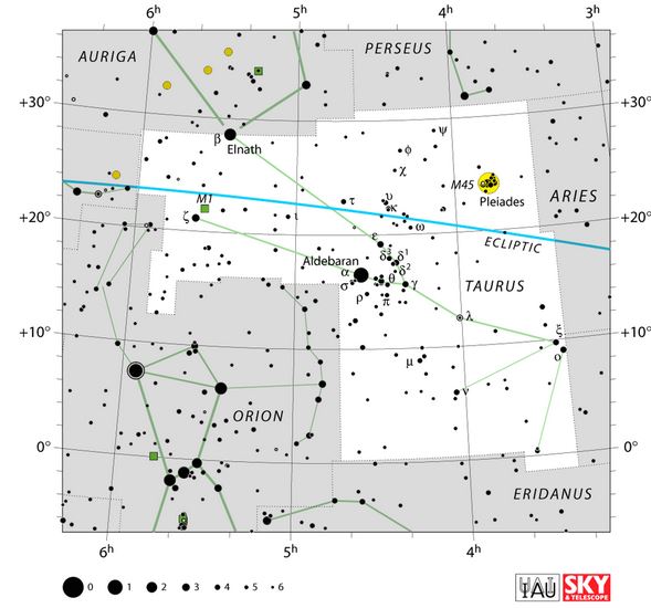 Mapa de estrellas de la constelación de Tauro, fuente Unión astronómica Internacional.