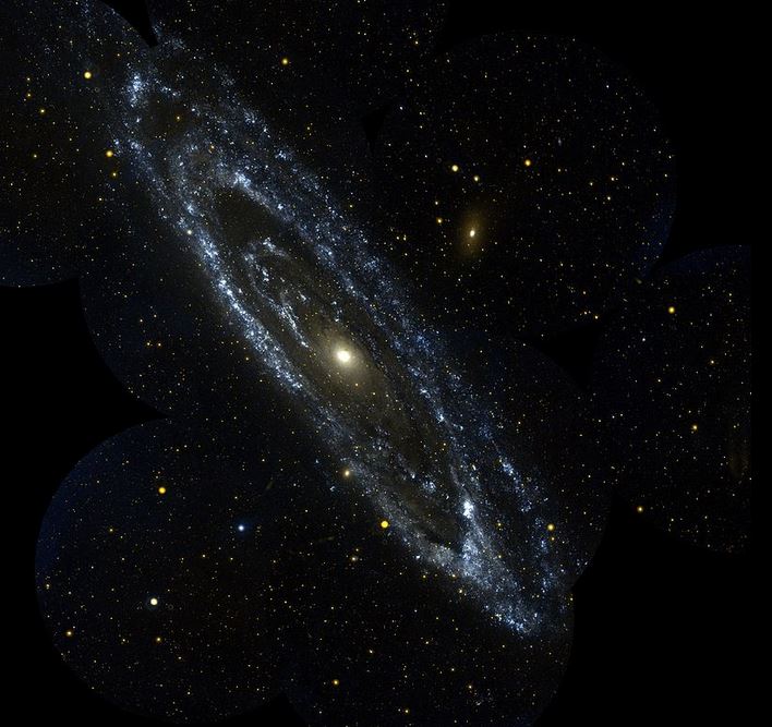 Galaxia de Andrómeda en ultravioleta, se la denomina M31 o NGC 224. Mosaico de imágenes tomadas por el telescopio GALEX.