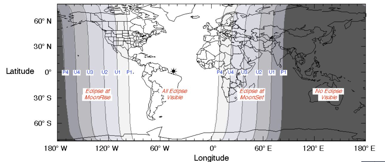 Zonas de la Tierra donde será visible el eclipse, la zona blanca central es donde se observará como Total. Imagen de NASA, pulsar para verla en detalle