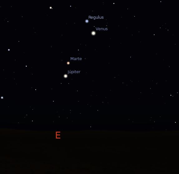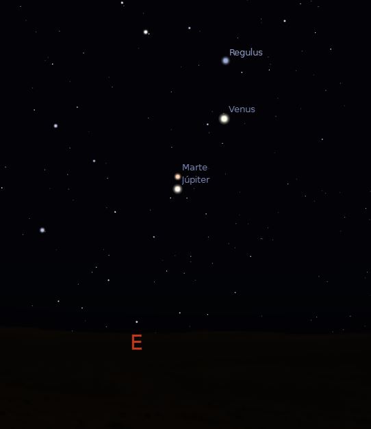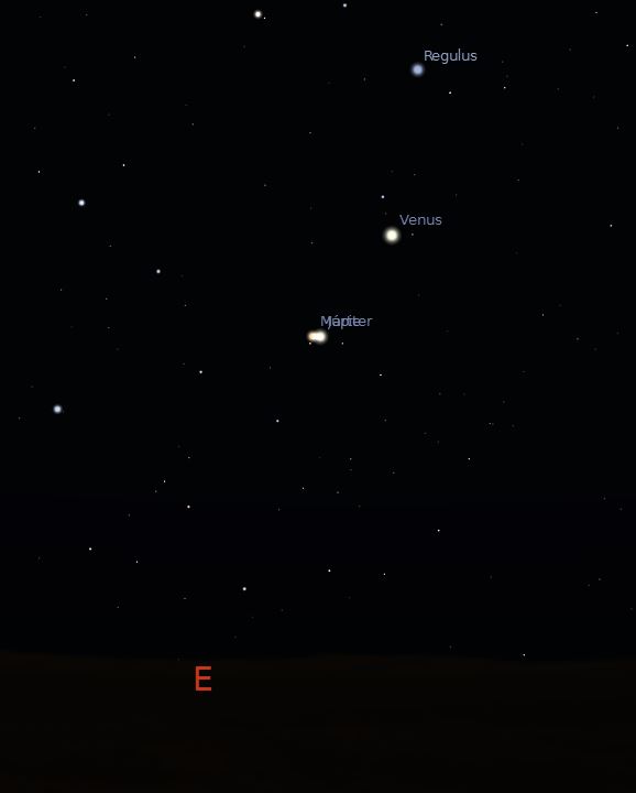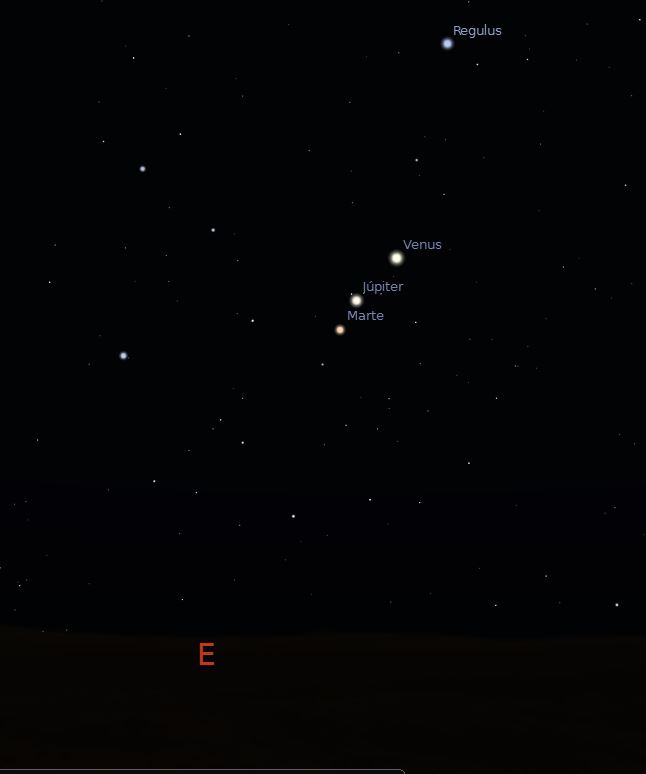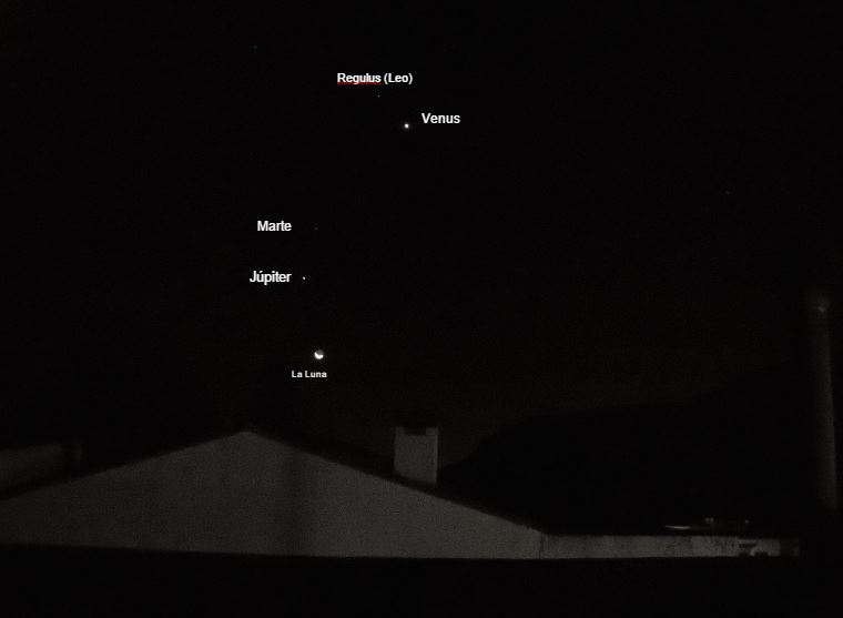 Este mes de octubre podéis ver unas preciosas conjunciones con la Luna, Venus, Júpiter y Marte como protagonistas. También se podrá ver muy cerca del planeta Venus la estrella Régulo de Leo. Un hermoso evento para el que tenemos que madrugar pues será a partir de las horas cercanas al amanecer cuando se podrá apreciar en toda su plenitud y observando hacia el Este. Cómo ejemplo os dejo esta imagen tomada el día 10 de octubre a las 6:30 AM: