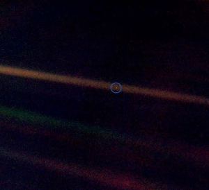 En su libro Un Punto Azul Pálido: Una Visión del Futuro Humano en el Espacio realiza este evocador pensamiento entre filosófico y emocionante que paso a poner a continuación, antes mirad la imagen de la Tierra tomada desde la Voyager 2 en 1990: