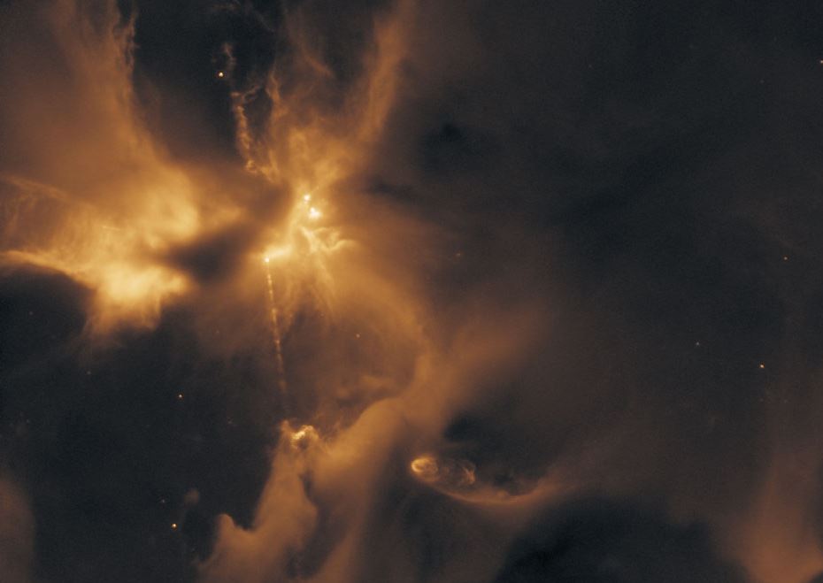 A medida que la cámara virtual vuela dentro de la nebulosa oscura, las estrellas pasan fuera de la pantalla, y los detalles de las estrellas que se forman y sus chorros de emisión se revelan de forma sublime. La estrella central está ocultada por una enorme cantidad de gas y polvo, pero sus prominentes chorros de emisión se asemejan a una espada láser de doble hoja cósmicas, parecida a las que podemos ver en las películas de la saga Star Wars.