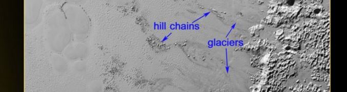 El planeta enano Plutón no deja de sorprendernos, ahora se ha observado que los glaciares de hielo de nitrógeno en Plutón parecen llevar una carga realmente curiosa: numerosas colinas, estas pueden ser fragmentos de hielo de agua que vienen desde las tierras altas de Plutón.