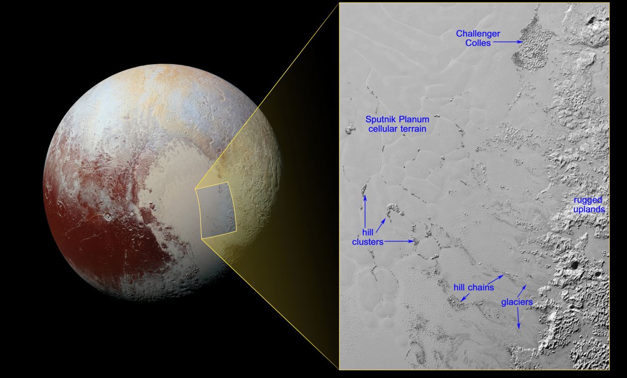 El planeta enano Plutón no deja de sorprendernos, ahora se ha observado que los glaciares de hielo de nitrógeno en Plutón parecen llevar una carga realmente curiosa: numerosas colinas, estas pueden ser fragmentos de hielo de agua que vienen desde las tierras altas de Plutón.