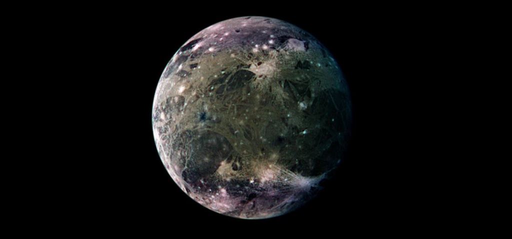 Ganímedes, es el mayor de los satélites de Júpiter y el mayor de todo el sistema solar con un radio es de 2.631 kilómetros. Es incluso más grande que el planeta Mercurio, pero tan sólo tiene la mitad de su masa.