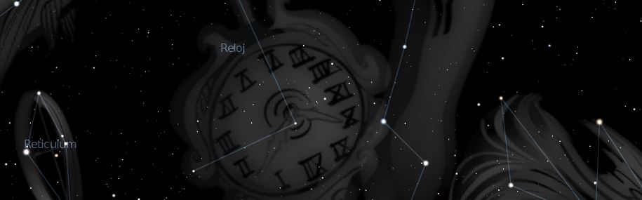 Constelación del Reloj en el cielo, podemos encontrarla entre la constelación de Reticulum y la constelación de Eridanus, la estrella Achernar de Eridanus nos puede servir de referencia para encontrarla pues se trata de una constelación con estrellas débiles.