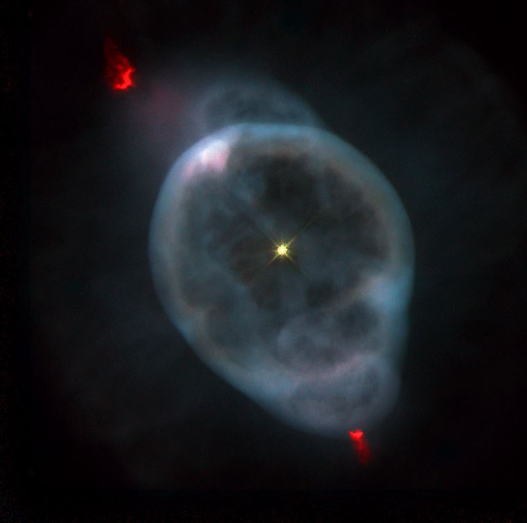 Se trata de la nebulosa NGC 3242 o «Fantasma de Júpiter».Esta nebulosa tan curiosa está a unos 1.400 años luz de nuestro planeta, en la constelación de Hydra. La imagen nos muestra una serie de anillos concéntricos alrededor de una estrella moribunda y que da la sensación de un fantasma del planeta Júpiter, esta extraña forma es el resultado final de la expulsión de material durante la muerte de la estrella, que por cierto era una estrella como nuestro Sol, por tanto el final de nuestra estrella será como el que veis en la imagen.