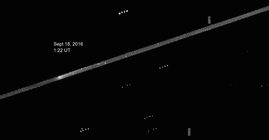 Estas observaciones las podemos apreciar en una serie de 15 imágenes del cometa 67P / CG tomadas entre el 17 y 18 de septiembre de 2016. El cometa pasa a través del campo de visión de Kepler, de arriba a la derecha abajo a la izquierda, por la banda diagonal. Los puntos blancos representan las estrellas y otras regiones en el espacio estudiadas por Kepler. Crédito: C. Snodgrass (The Open University) y E. Ryan (Instituto SETI)