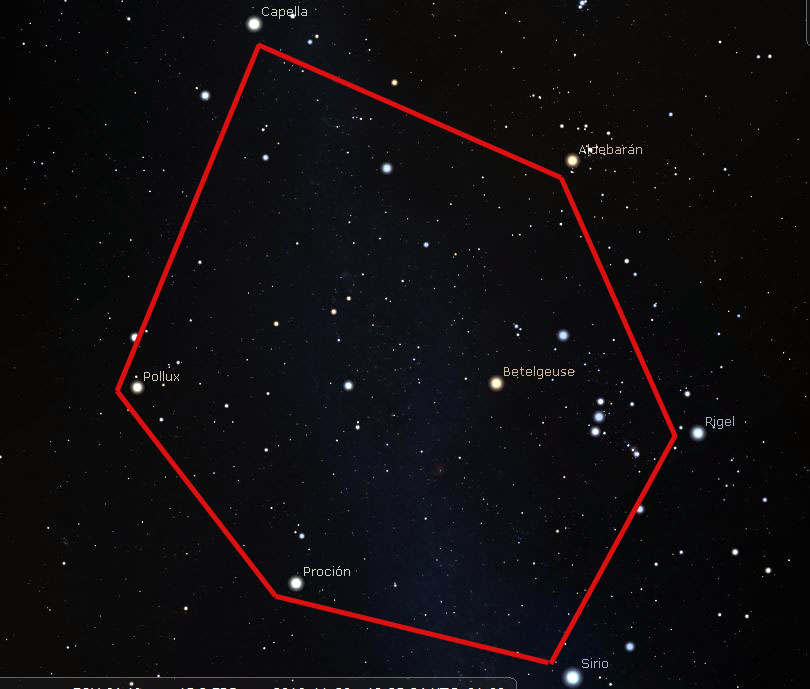 Un asterismo que nos ayudará mucho a situarnos en el cielo, en invierno, es el hexágono de invierno. Está formado por seis estrellas muy brillantes en nuestros cielos: