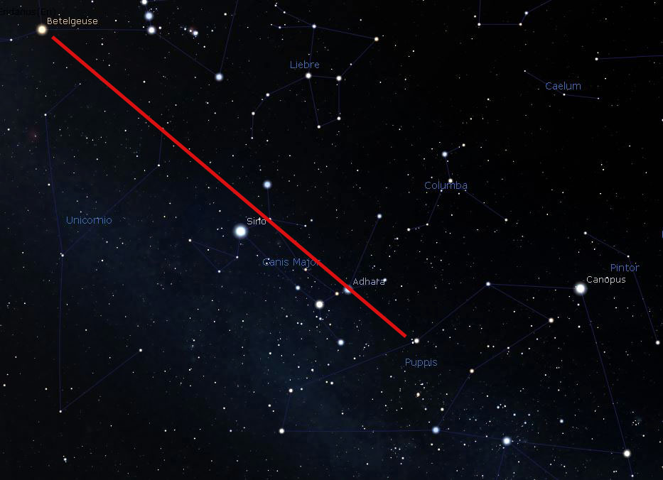 Desde Betelgeuse en Orión, hasta Sirio en Can Mayor, y siguiendo esa línea, llegamos a la constelación de Puppis o Popa.