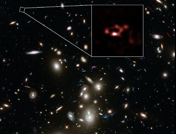 Los astrónomos han utilizado los radiotelescopios ALMA para detectar una enorme masa de polvo de estrellas que brilla intensamente en una galaxia vista cuando el Universo tenía sólo un cuatro por ciento de su edad actual, es la galaxia más distante en la que se ha detectado polvo. Esta observación también es la más distante de detección de oxígeno en el Universo, el objeto se llama A2744_YD4. La galaxia se nos aparece como lo era cuando el universo tenía sólo 600 millones de años, durante el período en que las primeras estrellas y galaxias se estaban formando. La sorpresa ha sido encontrar que esta galaxia tan joven contenía una gran cantidad de polvo interestelar (formación de polvo por la muerte de una generación anterior de estrellas). Estos nuevos resultados proporcionan una marca nueva sobre la visión de los nacimientos y muertes explosivos de las primeras estrellas.