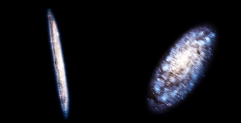 El vídeo ilustra cómo sus formas observadas pueden variar en gran medida dependiendo del ángulo en el que se observan. La forma espiral de las galaxias NGC 4302 (izquierda) y NGC 4298 (derecha) se visualizan en tres dimensiones y se giran para mostrar cómo podrían observarse si se mira desde otras perspectivas. Cada galaxia podría ser vista como una cara en espiral más o menos circular, como una espiral larga, delgada o de canto.