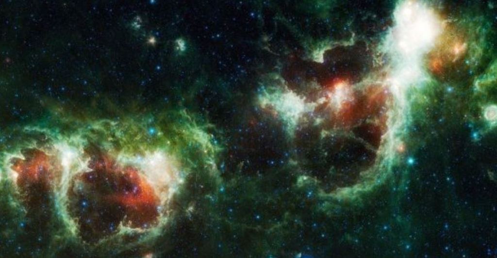 La imagen anterior fue obtenida en luz infrarroja por el recientemente lanzado telescopio WISE. La luz infrarroja penetra bien dentro de las burbujas vastas y complejas creadas por estrellas recién formadas en el interior de estas dos regiones de formación de estrellas masivas. Los estudios sobre las estrellas y el polvo, como los encontrados en las Nebulosas del Corazón y del Alma, se han centrado en cómo se forman las estrellas masivas y cómo afectan su medio ambiente.