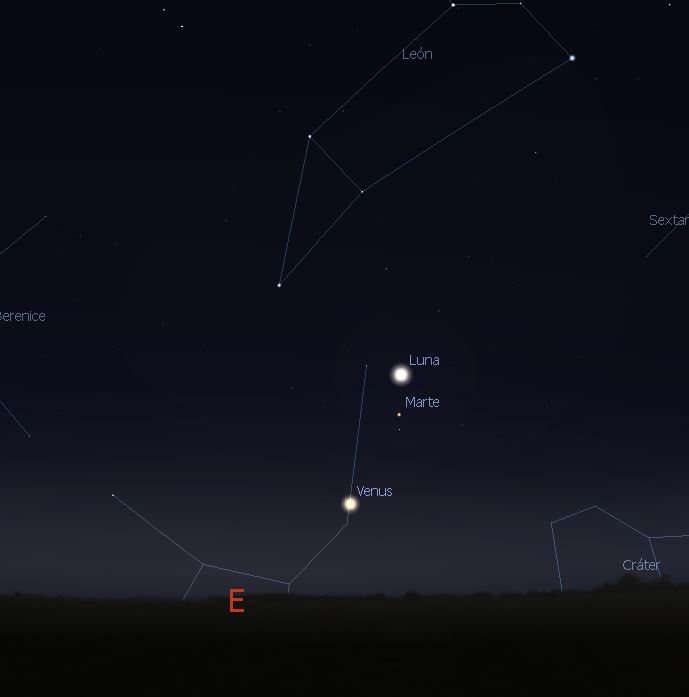 Sobre las 7 AM podéis empezar a apreciar este precioso espectaculo en el cielo, en el que muy cerca entre sí, aparentemente pues están a millones de km unos de otros, podéis observar a estos tres astros.