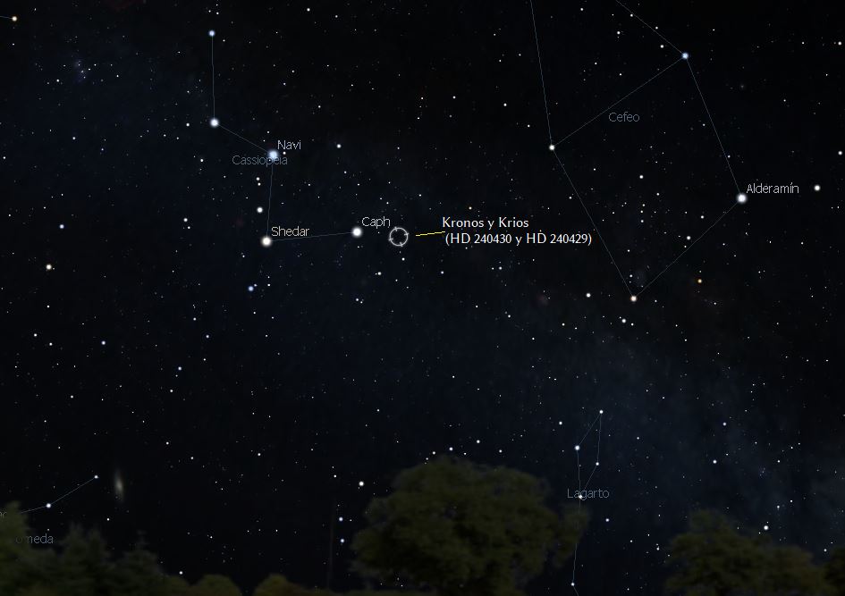 Posición de Kronos y Krios en el cielo, los podemos encontrar en la constelación de Casiopea como un par de estrellas de magnitud 10, observable con telescopios.