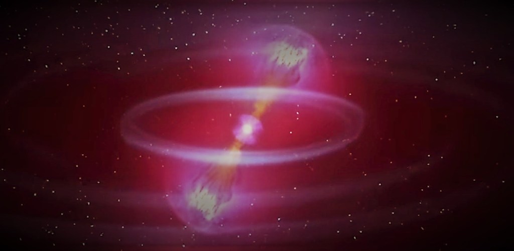Las ondas gravitacionales (arcos pálidos) desangran la energía orbital, haciendo que las estrellas se muevan más juntas y se fusionen. Cuando las estrellas chocan, algunos de sus restos se disparan en chorros de partículas que se mueven a casi la velocidad de la luz, produciendo una breve ráfaga de rayos gamma (color magenta). Además de los jets ultrarrápidos que alimentan los rayos gamma, la fusión también genera restos más lentos. Un flujo de salida impulsado por la acumulación en el remanente de fusión emite una luz ultravioleta que se desvanece rapidamente (color violeta). Una nube densa de restos muy calientes, despojada de las estrellas de neutrones justo antes de la colisión, produce luz visible e infrarroja (azul-blanco y rojo). El brillo ultravioleta, óptico y de infrarrojo cercano se denomina colectivamente kilonova. Esta animación representa fenómenos observados hasta nueve días después de GW170817. Créditos: NASA