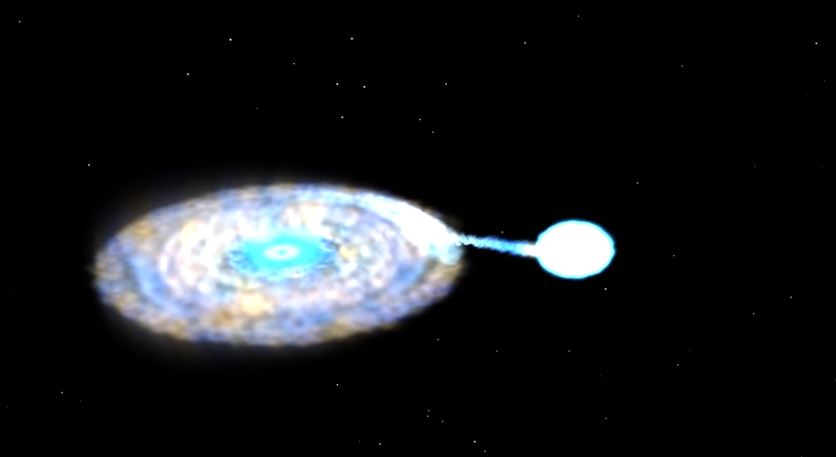 Mientras giran, un púlsar superdenso extrae el gas de una enana blanca. Las dos estrellas están tan cerca que encajarían entre la Tierra y la Luna.