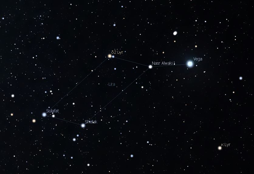 liraConstelación de Lira, podemos ver arriba a la estrella vega, y entre las estrellas Sulafat y Sheliak podemos encontrar con telescopios la famosa nebulosa del anillo (M57). Imagen de stellarium.