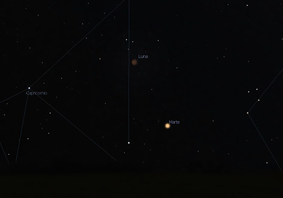 Posición de Marte y la Luna el día 27 de julio a las 22:45 h (hora local en España), se puede observar en dirección Sureste, podremos observar el eclipse de Luna y la oposición de Marte.