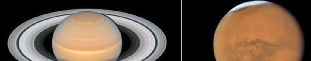En el verano de 2018, los planetas Marte y Saturno están, uno detrás de otro, en oposición a la Tierra. Durante ese evento, los planetas están relativamente cerca de la Tierra, lo que permite a los astrónomos observarlos con mayor detalle. El telescopio espacial Hubble ha aprovechado esta carambola astronómica para tomar imágenes de ambos planetas.