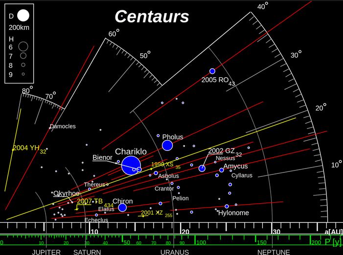 Los centauros son asteroides que se encuentran entre Júpiter y Saturno, y que describen órbitas cruzando estos dos planetas.
