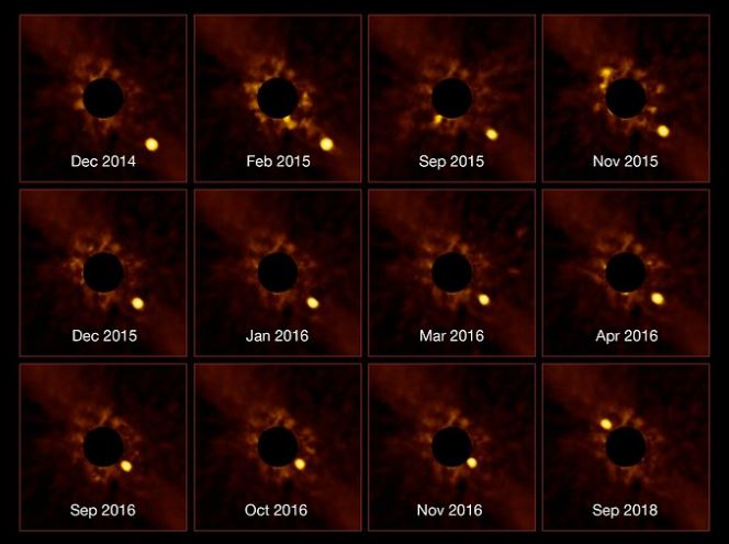 El VLT (Very large Telescope) de ESO ha capturado el espectacular movimiento de un exoplaneta alrededor de su estrella anfitriona. En una serie de imágenes desde 2014 hasta 2018 han conseguido seguir y realizar un pequeño vídeo con su movimiento. Se trata de un enorme exoplaneta llamado Beta Pictoris b.