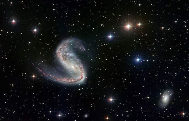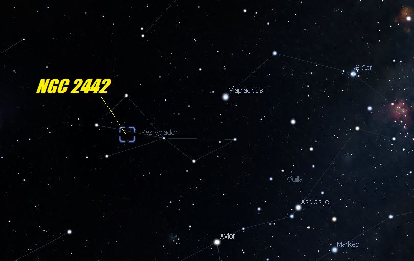Puede observarse toda la galaxia y el precioso y estrellado cielo circundante, se pueden observar claramente sus brazos espirales claramente asimétricos. La estructura distorsionada probablemente se deba a un antiguo encuentro cercano con la galaxia más pequeña que puede verse en la parte inferior derecha de la imagen, galaxia que está a unos 150.000 años luz de NGC 2442.