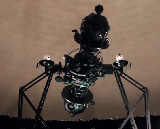 La estrella del planetario es su proyector que es el aparato que nos recrea el cielo estrellado sobre la cúpula. Es un sistema complejo que consigue una imagen realista del cielo con mucha precisión, reproduce el movimiento en el cielo de miles de estrellas, podemos ver también el movimiento del Sol, la Luna, los planetas visibles a simple vista, proyectar coordenadas celestes, figuras de las constelaciones, nebulosas, galaxias, cúmulos, la Vía Láctea, el Sistema Solar visto desde afuera, estrellas fugaces, satélites artificiales, e incluso simular nubes, el atardecer, anochecer….