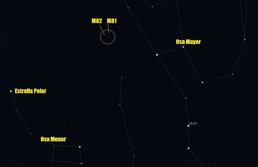 ¿Donde podemos encontrarlas?, podemos verlas en la constelación de la Osa Mayor. Con pequeños telescopios ya podemos empezar a apreciarla a M81 como una macha redondeada de brillo suave. Junto a ella, aunque no relacionadas, se encuentra otra galaxia, M82 esta un poco más complicada de observar con pequeños telescopios, ya necesitaríamos telescopios de gama media para observar ambas galaxias.