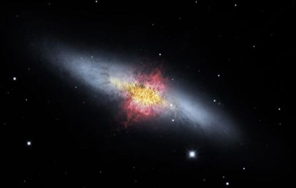 Un grupo de astrofísicos usando el observatorio SOFIA, han encontrado que el viento galáctico que fluye desde M82 pesa muchísimo, transporta aproximadamente la masa equivalente de 50 a 60 millones de soles en gas y polvo, alineado a lo largo de un campo magnético, el viento transporta estos materiales al espacio intergaláctico.